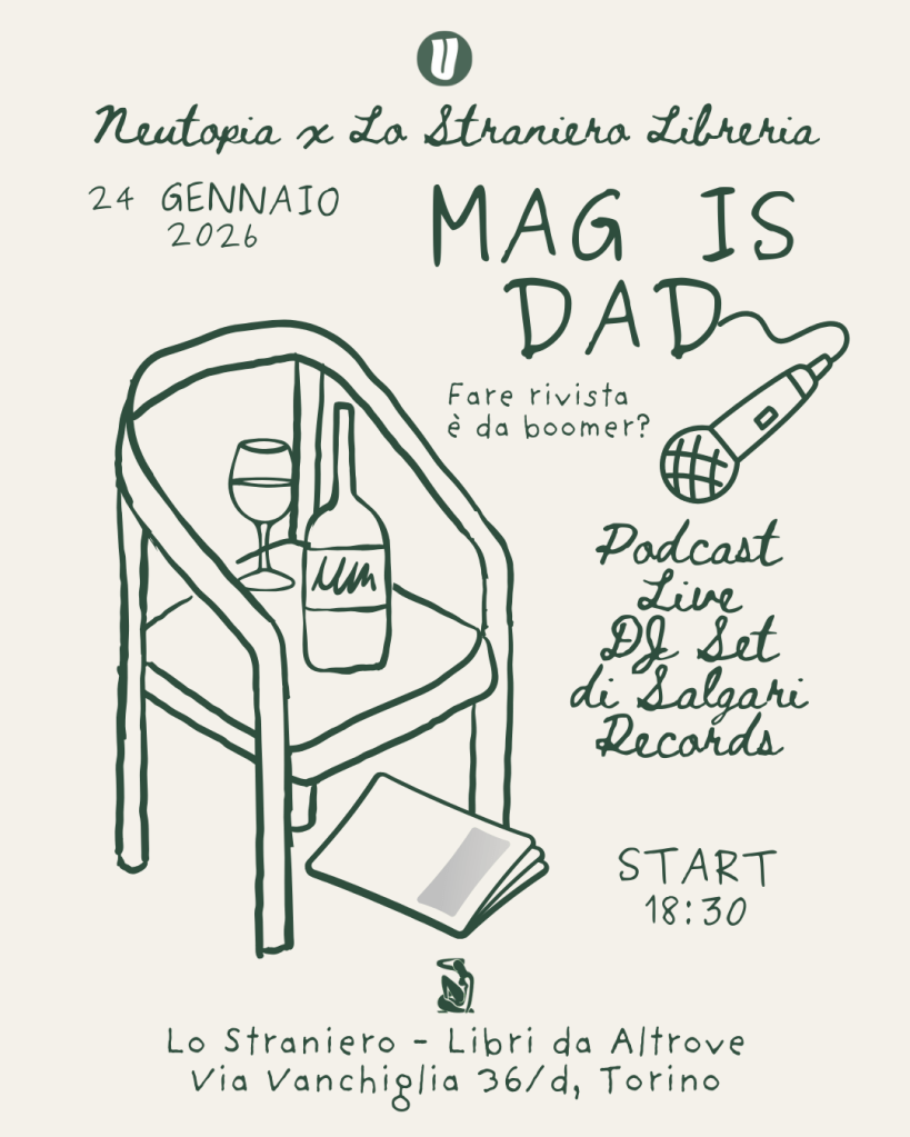 Il 24 Gennaio 2026 incontreremo Neutopia, la rivista del possibile, con Luca Gringeri, direttore responsabile, Davide Galipò, direttore editoriale, Elena Cappai Bonanni, Leandra Verrilli e Irene Dorigotti, redattrici del magazine.