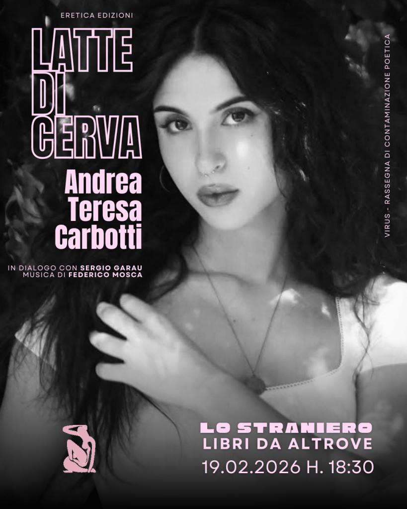 Andrea Teresa Carbotti, classe 2003, è una poeta e performer di origini pugliesi. Inserita nel panorama della poesia performativa e spoken-word artist, attualmente vive fra Roma e Torino, dove si è trasferita dopo aver compiuto studi classici, per dedicarsi alla letteratura e alle discipline teatrali. Si è laureata nel 2025 in Letteratura Musica e Spettacolo presso l’Università La Sapienza di Roma, con una tesi sul ruolo archetipico del mito nella letteratura contemporanea e postmoderna. Al momento studia Antropologia e alla Scuola Holden. Latte di cerva è la sua prima pubblicazione.